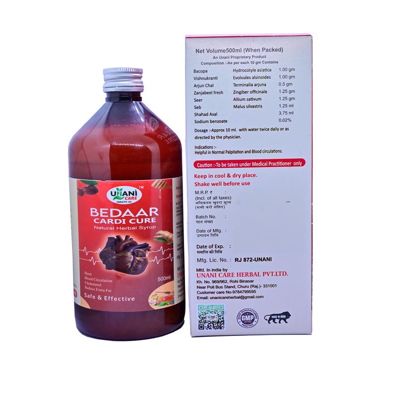 Protect your heart naturally with Unani Care Bedaar Cardi Cure. This 500ml herbal tonic is specially formulated to strengthen heart muscles, improve blood circulation, and maintain healthy cholesterol levels using a potent blend of traditional Unani herbs.