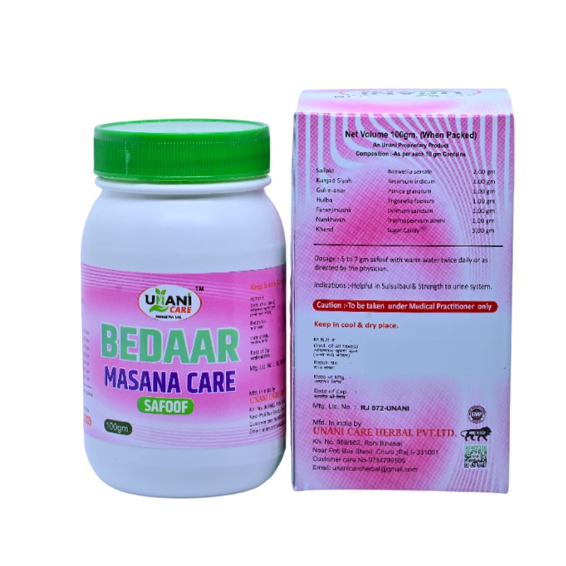 Bedaar Masana Care is a targeted Unani formulation designed to support the “Masana” (Urinary Bladder) and overall renal health. This fine herbal powder (Safoof) works to strengthen the bladder muscles and regulate urinary functions. It is an ideal natural supplement for those experiencing urinary weakness or looking to maintain long-term kidney and bladder wellness.